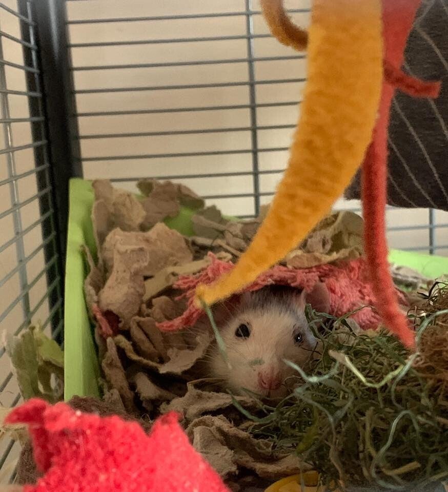 Losse speeltijd buiten de kooi in een veilige, knaagproof rattenruimte